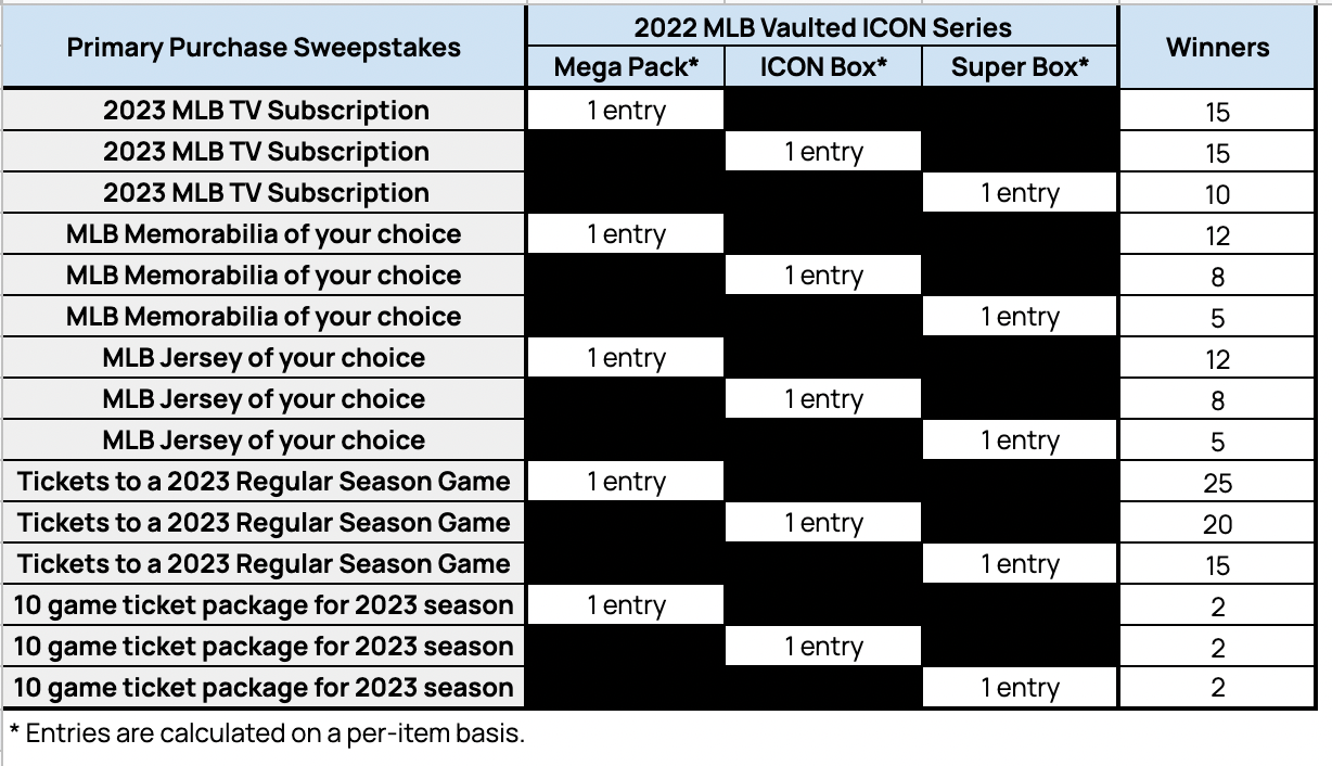 Every 2022 MLB Vaulted ICON Series item purchased gains you an additional entry into multiple sweepstakes to win prizes dedicated to enriching your MLB fandom! See the list below: