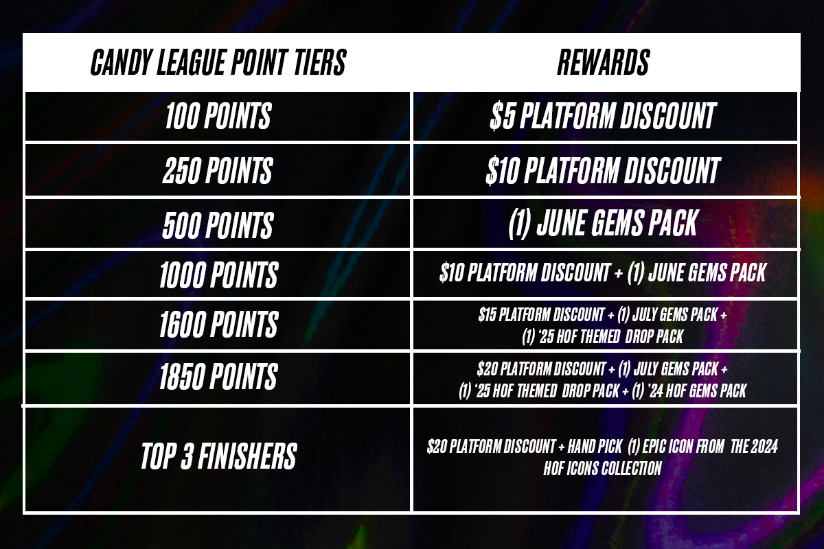 While our 2025 approach leans more immediate, don’t get it twisted: Candy League points will be tracked all season long. And when the season ends? Like, always the top collectors on the leaderboard will take home some epic rewards.