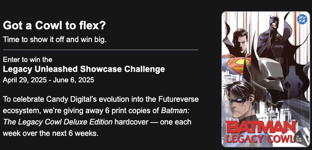 No purchase necessary to enter or win. Open to legal residents of the 50 U.S. states and D.C., ages 18+. Void where prohibited. One winner will be selected at random each week from April 29 to June 6, 2025. Each winner will receive one (1) Batman: The Legacy Cowl Deluxe Edition hardcover (approx. retail value: $50 USD). Limit one prize per person. Winners will be contacted via X (Twitter). Candy Digital will coordinate prize shipping after the final winner is announced on June 9, 2025. Please allow extra time for fulfillment. Additional terms apply. Please see complete terms and conditions for details.