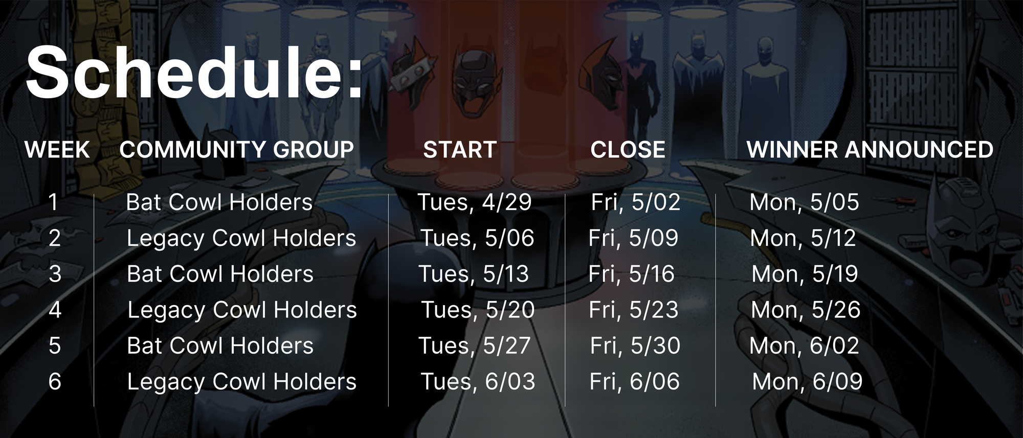 - Tag a new user and include #BatCowlShowcase or #LegacyCowlShowcase (so we don't miss your entry)