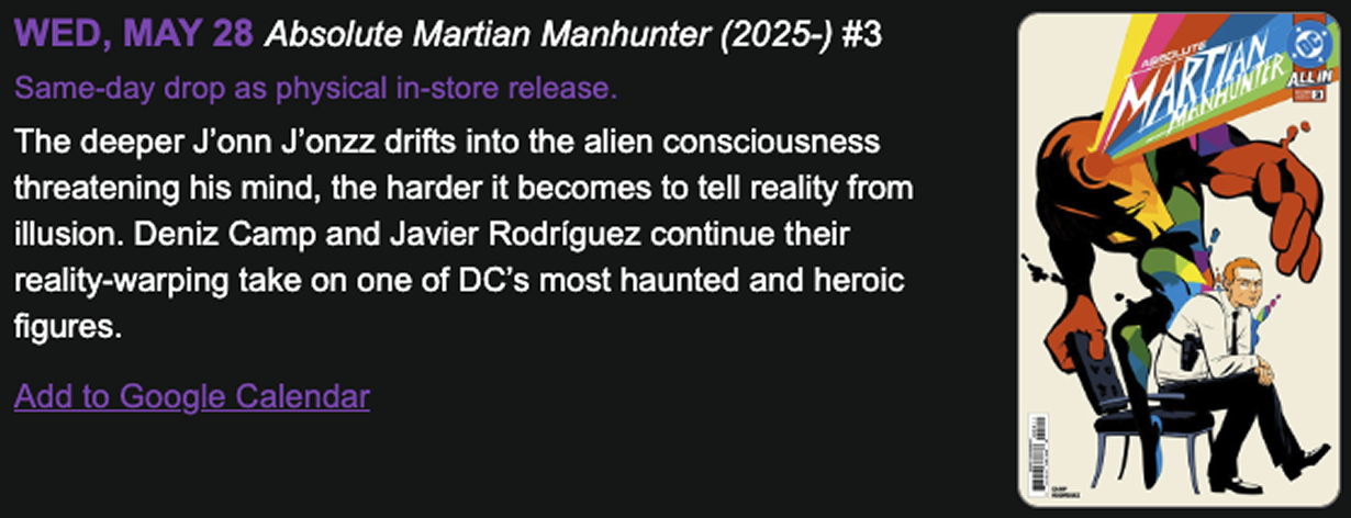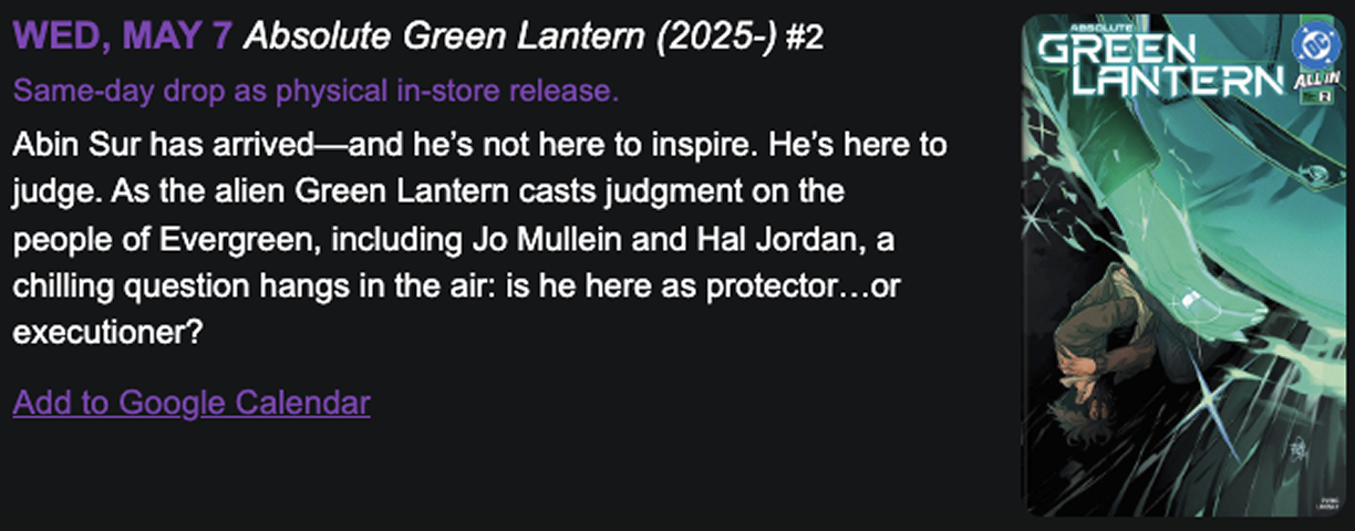 This month’s DC3s dive into personal reckonings, legacy-shifting confrontations, and the return of heroes and villains alike. From the cosmic judgment of Absolute Green Lantern (2025-) #2 to Supergirl’s identity crisis in Midvale, and Hush’s deepening grip on Gotham, these stories challenge what our heroes believe, who they trust, and what they stand for.